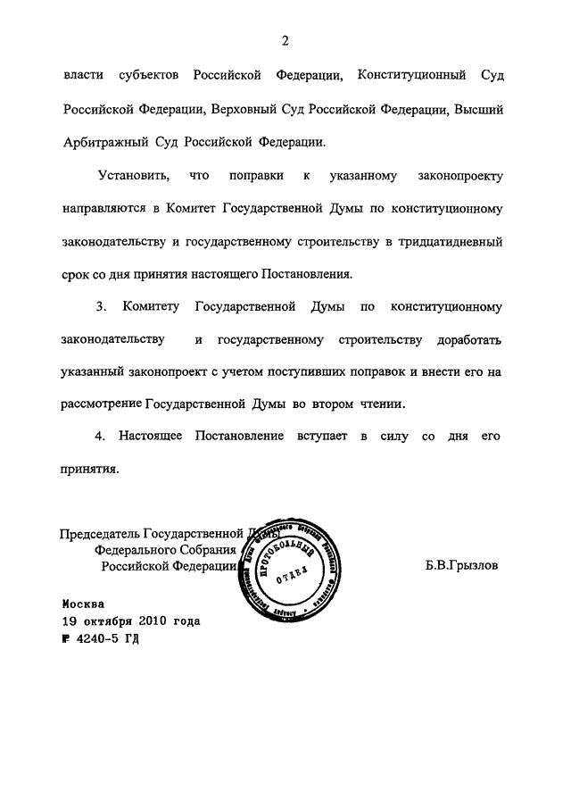 ПОСТАНОВЛЕНИЕ ГД ФС РФ от 19.10.2010 N 4240-5 ГД
