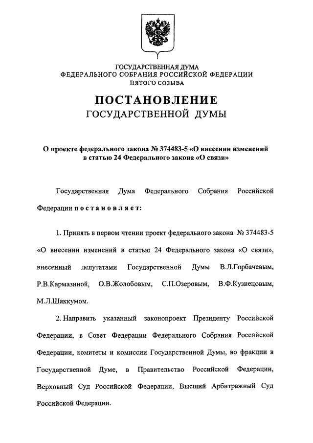 "О ПРОЕКТЕ ФЕДЕРАЛЬНОГО ЗАКОНА N 374483-5 "О ВНЕСЕНИИ ИЗМЕНЕНИЙ В СТАТЬЮ 24 ФЕДЕРАЛЬНОГО ЗАКОНА "О СВЯЗИ"