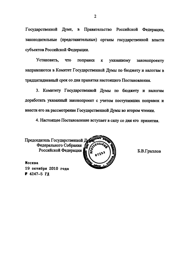 ПОСТАНОВЛЕНИЕ ГД ФС РФ от 19.10.2010 N 4247-5 ГД