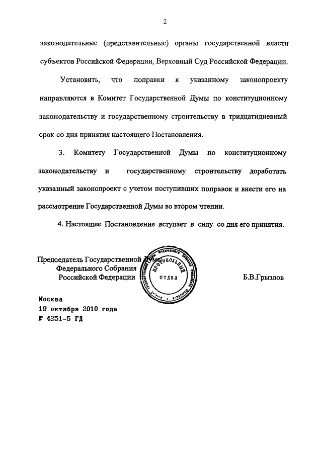 ПОСТАНОВЛЕНИЕ ГД ФС РФ от 19.10.2010 N 4251-5 ГД