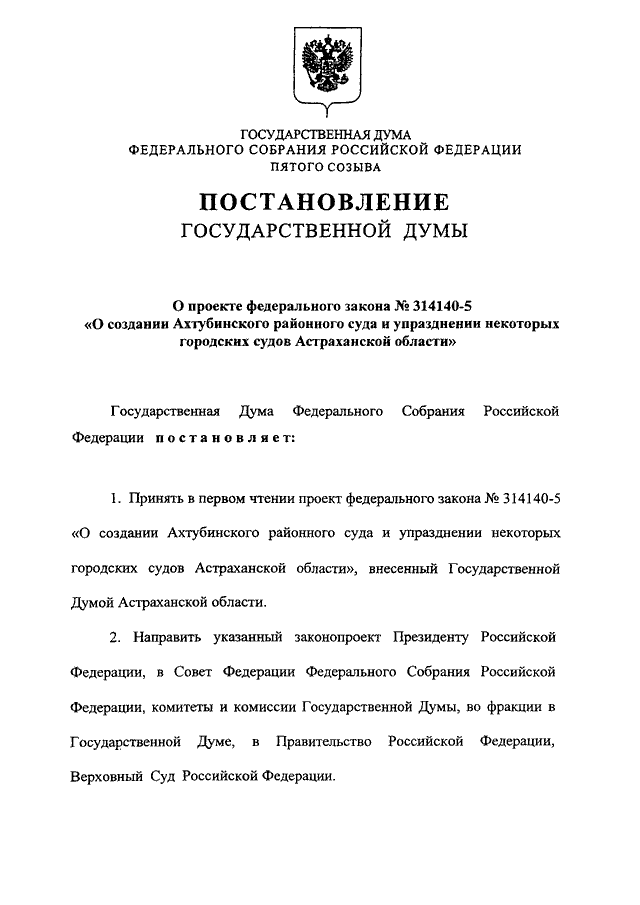 "О ПРОЕКТЕ ФЕДЕРАЛЬНОГО ЗАКОНА N 314140-5 "О СОЗДАНИИ АХТУБИНСКОГО РАЙОННОГО СУДА И УПРАЗДНЕНИИ НЕКОТОРЫХ ГОРОДСКИХ СУДОВ АСТРАХАНСКОЙ ОБЛАСТИ"