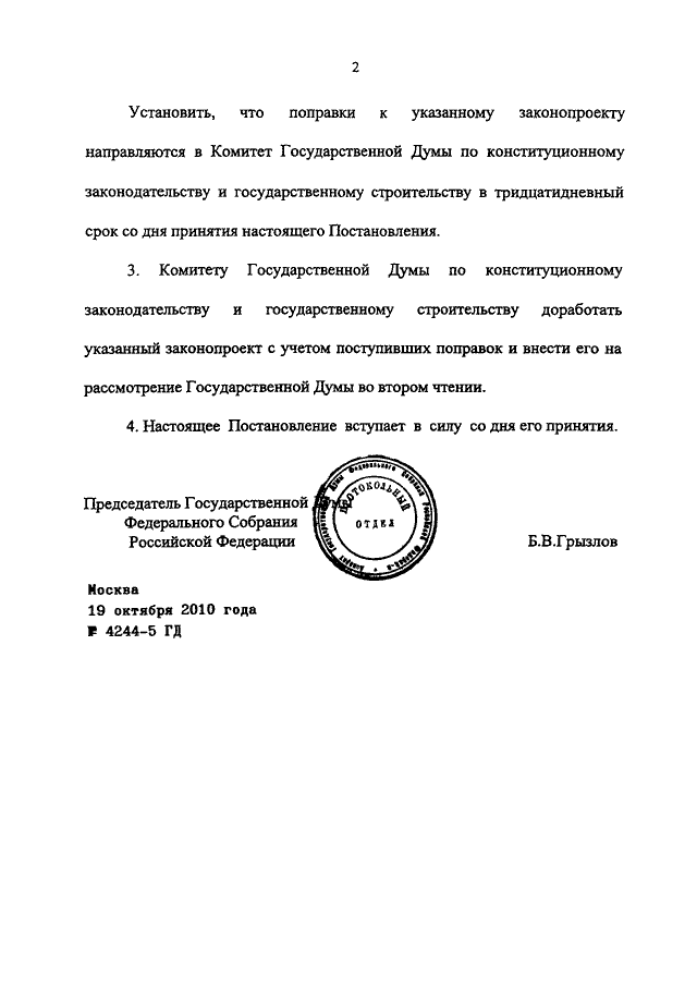 ПОСТАНОВЛЕНИЕ ГД ФС РФ от 19.10.2010 N 4244-5 ГД