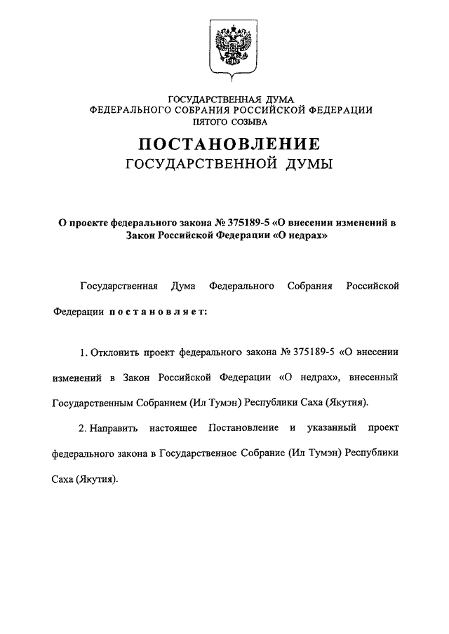 "О ПРОЕКТЕ ФЕДЕРАЛЬНОГО ЗАКОНА N 375189-5 "О ВНЕСЕНИИ ИЗМЕНЕНИЙ В ЗАКОН РОССИЙСКОЙ ФЕДЕРАЦИИ "О НЕДРАХ"