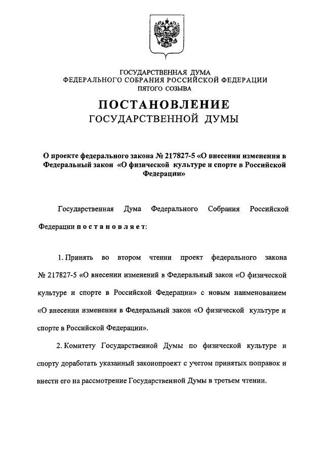 "О ПРОЕКТЕ ФЕДЕРАЛЬНОГО ЗАКОНА N 217827-5 "О ВНЕСЕНИИ ИЗМЕНЕНИЯ В ФЕДЕРАЛЬНЫЙ ЗАКОН "О ФИЗИЧЕСКОЙ КУЛЬТУРЕ И СПОРТЕ В РОССИЙСКОЙ ФЕДЕРАЦИИ"