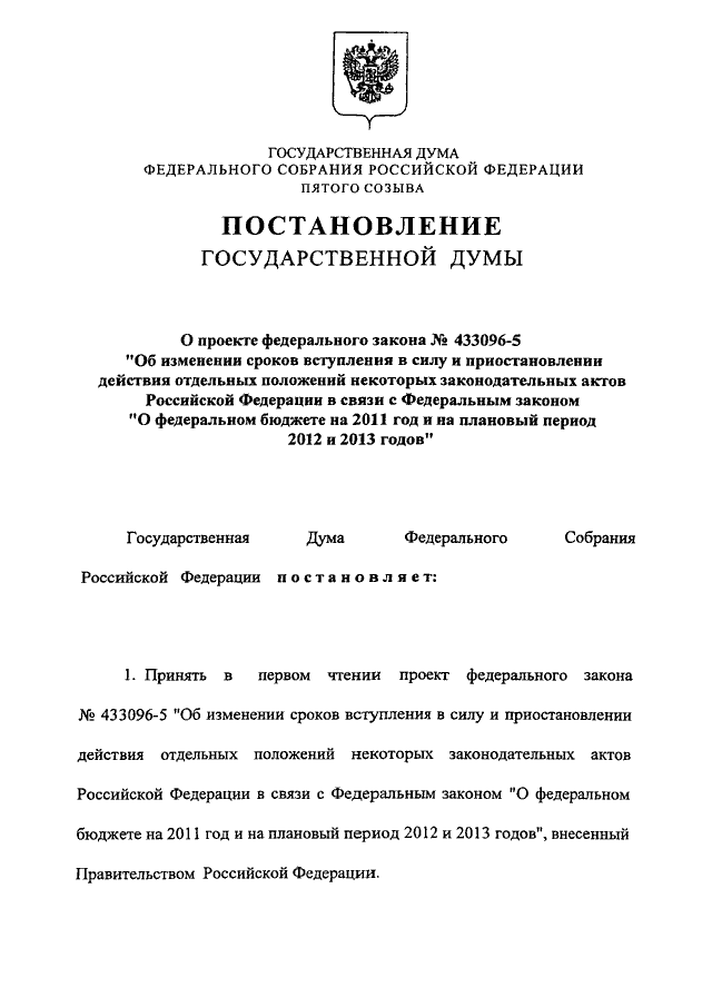 "О ПРОЕКТЕ ФЕДЕРАЛЬНОГО ЗАКОНА N 433096-5 "ОБ ИЗМЕНЕНИИ СРОКОВ