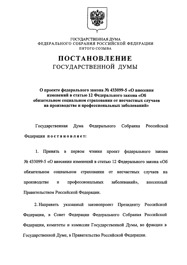 "О ПРОЕКТЕ ФЕДЕРАЛЬНОГО ЗАКОНА N 433099-5 "О ВНЕСЕНИИ ИЗМЕНЕНИЙ В СТАТЬЮ 12 ФЕДЕРАЛЬНОГО ЗАКОНА "ОБ ОБЯЗАТЕЛЬНОМ СОЦИАЛЬНОМ СТРАХОВАНИИ ОТ НЕСЧАСТНЫХ СЛУЧАЕВ НА ПРОИЗВОДСТВЕ И ПРОФЕССИОНАЛЬНЫХ ЗАБОЛЕВАНИЙ"