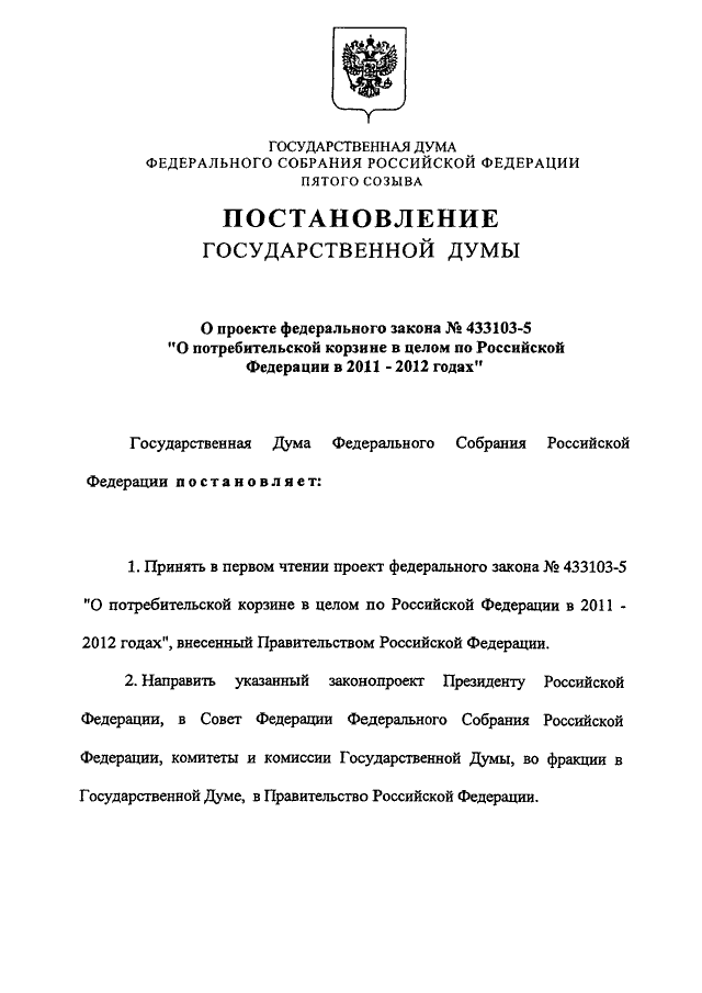 "О ПРОЕКТЕ ФЕДЕРАЛЬНОГО ЗАКОНА N 433103-5 "О ПОТРЕБИТЕЛЬСКОЙ КОРЗИНЕ В ЦЕЛОМ ПО РОССИЙСКОЙ ФЕДЕРАЦИИ В 2011 - 2012 ГОДАХ"