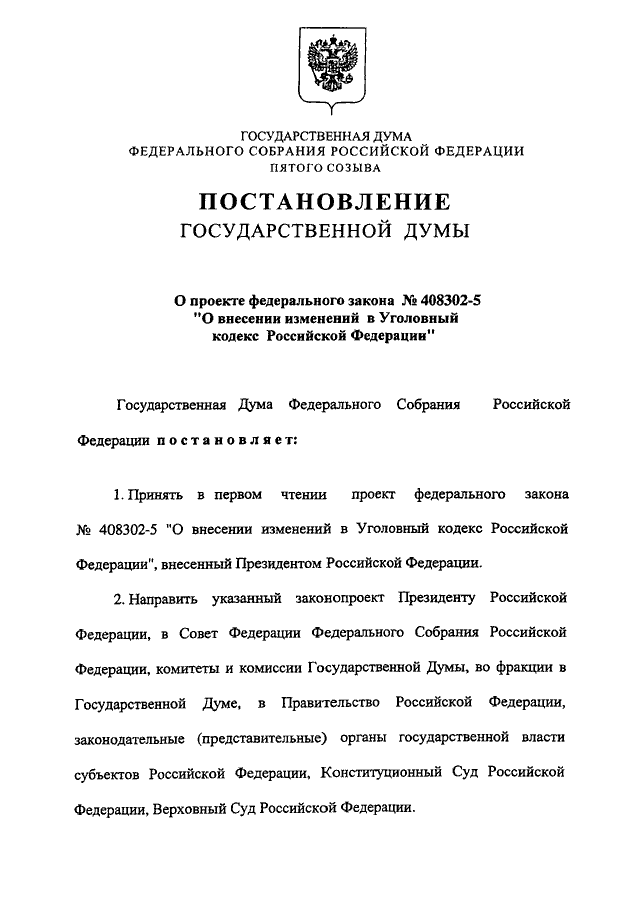 "О ПРОЕКТЕ ФЕДЕРАЛЬНОГО ЗАКОНА N 408302-5 "О ВНЕСЕНИИ ИЗМЕНЕНИЙ В УГОЛОВНЫЙ КОДЕКС РОССИЙСКОЙ ФЕДЕРАЦИИ"