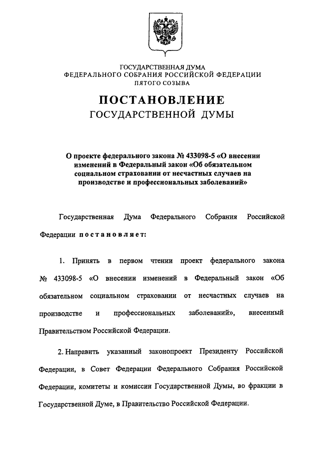 "О ПРОЕКТЕ ФЕДЕРАЛЬНОГО ЗАКОНА N 433098-5 "О ВНЕСЕНИИ ИЗМЕНЕНИЙ В ФЕДЕРАЛЬНЫЙ ЗАКОН "ОБ ОБЯЗАТЕЛЬНОМ СОЦИАЛЬНОМ СТРАХОВАНИИ ОТ НЕСЧАСТНЫХ СЛУЧАЕВ НА ПРОИЗВОДСТВЕ И ПРОФЕССИОНАЛЬНЫХ ЗАБОЛЕВАНИЙ"