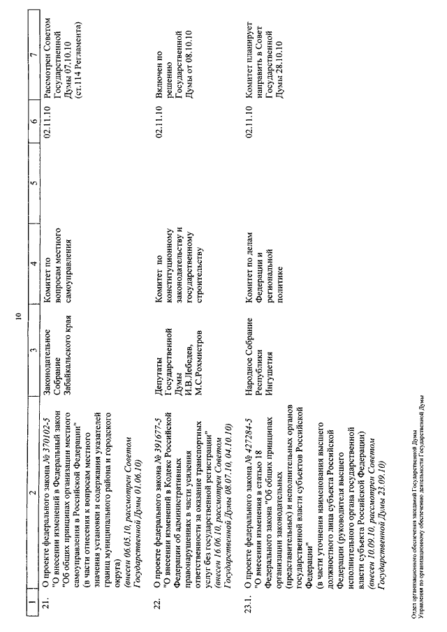 "О КАЛЕНДАРЕ РАССМОТРЕНИЯ ВОПРОСОВ ГОСУДАРСТВЕННОЙ ДУМОЙ СО 2 ПО 26 НОЯБРЯ 2010 ГОДА"