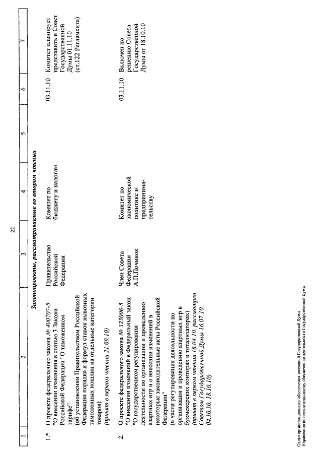 "О КАЛЕНДАРЕ РАССМОТРЕНИЯ ВОПРОСОВ ГОСУДАРСТВЕННОЙ ДУМОЙ СО 2 ПО 26 НОЯБРЯ 2010 ГОДА"