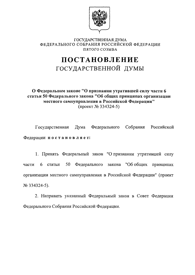 "О ФЕДЕРАЛЬНОМ ЗАКОНЕ "О ПРИЗНАНИИ УТРАТИВШЕЙ СИЛУ ЧАСТИ 6 СТАТЬИ 50 ФЕДЕРАЛЬНОГО ЗАКОНА "ОБ ОБЩИХ ПРИНЦИПАХ ОРГАНИЗАЦИИ МЕСТНОГО САМОУПРАВЛЕНИЯ В РОССИЙСКОЙ ФЕДЕРАЦИИ" (ПРОЕКТ N 334324-5)"
