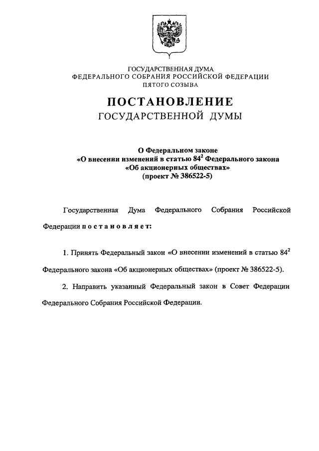 "О ФЕДЕРАЛЬНОМ ЗАКОНЕ "О ВНЕСЕНИИ ИЗМЕНЕНИЙ В СТАТЬЮ 84.2 ФЕДЕРАЛЬНОГО ЗАКОНА "ОБ АКЦИОНЕРНЫХ ОБЩЕСТВАХ" (ПРОЕКТ N 386522-5)"