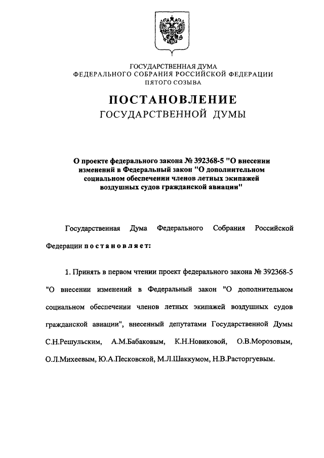 "О ПРОЕКТЕ ФЕДЕРАЛЬНОГО ЗАКОНА N 392368-5 "О ВНЕСЕНИИ ИЗМЕНЕНИЙ В ФЕДЕРАЛЬНЫЙ ЗАКОН "О ДОПОЛНИТЕЛЬНОМ СОЦИАЛЬНОМ ОБЕСПЕЧЕНИИ ЧЛЕНОВ ЛЕТНЫХ ЭКИПАЖЕЙ ВОЗДУШНЫХ СУДОВ ГРАЖДАНСКОЙ АВИАЦИИ"