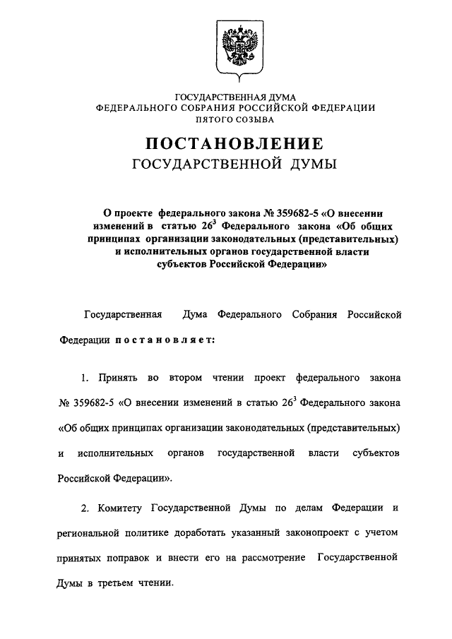 "О ПРОЕКТЕ ФЕДЕРАЛЬНОГО ЗАКОНА N 359682-5 "О ВНЕСЕНИИ ИЗМЕНЕНИЙ В СТАТЬЮ 26.3 ФЕДЕРАЛЬНОГО ЗАКОНА "ОБ ОБЩИХ ПРИНЦИПАХ ОРГАНИЗАЦИИ ЗАКОНОДАТЕЛЬНЫХ (ПРЕДСТАВИТЕЛЬНЫХ) И ИСПОЛНИТЕЛЬНЫХ ОРГАНОВ ГОСУДАРСТВЕННОЙ ВЛАСТИ СУБЪЕКТОВ РОССИЙСКОЙ ФЕДЕРАЦИИ"