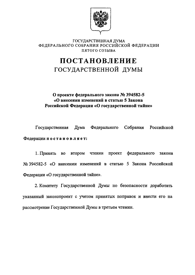 "О ПРОЕКТЕ ФЕДЕРАЛЬНОГО ЗАКОНА N 394582-5 "О ВНЕСЕНИИ ИЗМЕНЕНИЙ В СТАТЬЮ 5 ЗАКОНА РОССИЙСКОЙ ФЕДЕРАЦИИ "О ГОСУДАРСТВЕННОЙ ТАЙНЕ"