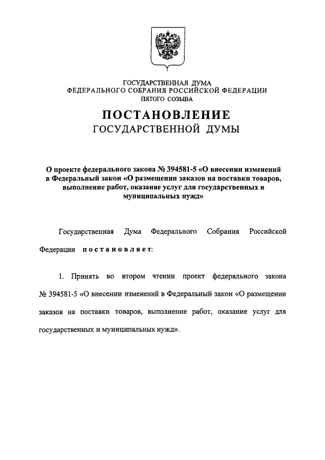 "О ПРОЕКТЕ ФЕДЕРАЛЬНОГО ЗАКОНА N 394581-5 "О ВНЕСЕНИИ ИЗМЕНЕНИЙ В ФЕДЕРАЛЬНЫЙ ЗАКОН "О РАЗМЕЩЕНИИ ЗАКАЗОВ НА ПОСТАВКИ ТОВАРОВ, ВЫПОЛНЕНИЕ РАБОТ, ОКАЗАНИЕ УСЛУГ ДЛЯ ГОСУДАРСТВЕННЫХ И МУНИЦИПАЛЬНЫХ НУЖД"