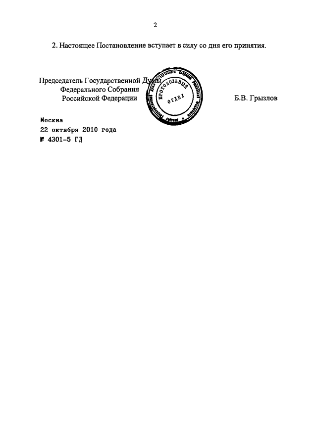 ПОСТАНОВЛЕНИЕ ГД ФС РФ от 22.10.2010 N 4301-5 ГД