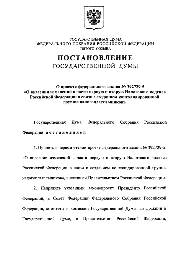 "О ПРОЕКТЕ ФЕДЕРАЛЬНОГО ЗАКОНА N 392729-5 "О ВНЕСЕНИИ ИЗМЕНЕНИЙ В ЧАСТИ ПЕРВУЮ И ВТОРУЮ НАЛОГОВОГО КОДЕКСА РОССИЙСКОЙ ФЕДЕРАЦИИ В СВЯЗИ С СОЗДАНИЕМ КОНСОЛИДИРОВАННОЙ ГРУППЫ НАЛОГОПЛАТЕЛЬЩИКОВ"