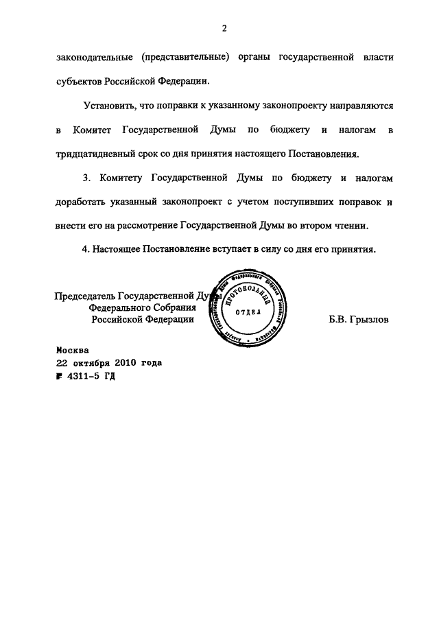 ПОСТАНОВЛЕНИЕ ГД ФС РФ от 22.10.2010 N 4311-5 ГД