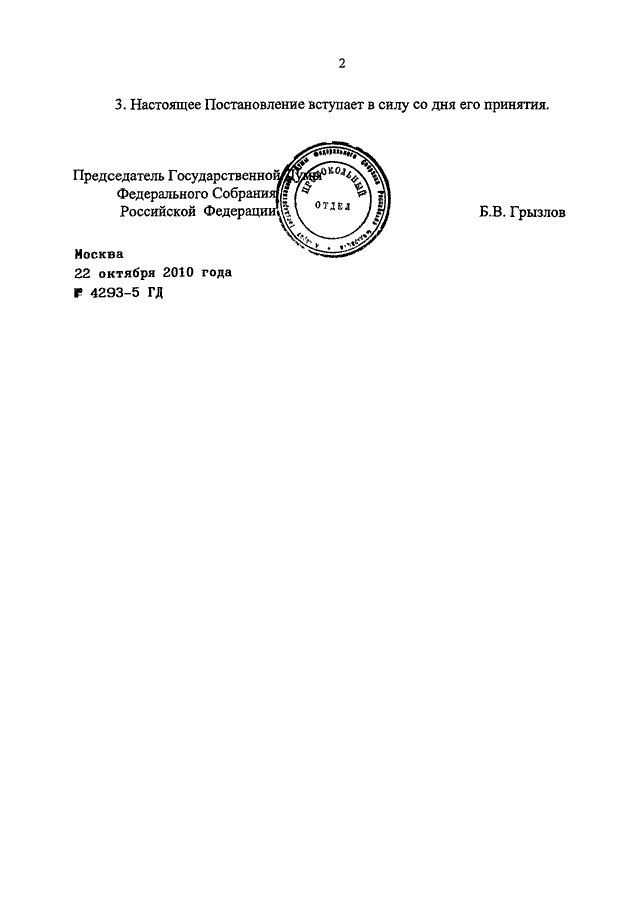 ПОСТАНОВЛЕНИЕ ГД ФС РФ от 22.10.2010 N 4293-5 ГД