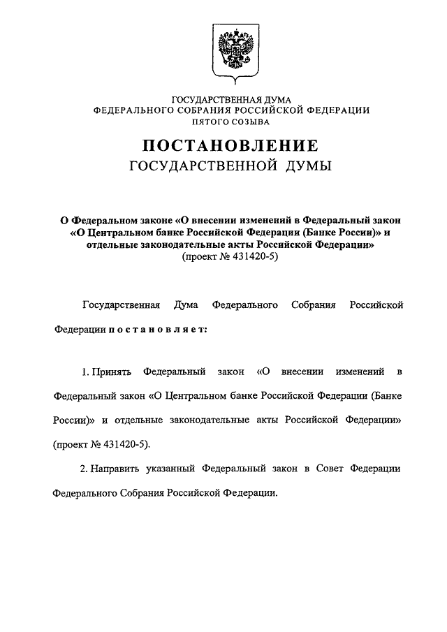 "О ФЕДЕРАЛЬНОМ ЗАКОНЕ "О ВНЕСЕНИИ ИЗМЕНЕНИЙ В ФЕДЕРАЛЬНЫЙ ЗАКОН "О ЦЕНТРАЛЬНОМ БАНКЕ РОССИЙСКОЙ ФЕДЕРАЦИИ (БАНКЕ РОССИИ)" И ОТДЕЛЬНЫЕ ЗАКОНОДАТЕЛЬНЫЕ АКТЫ РОССИЙСКОЙ ФЕДЕРАЦИИ" (ПРОЕКТ N 431420-5)"