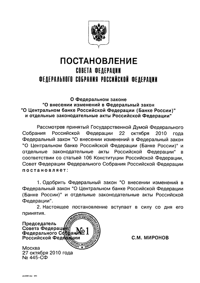 ПОСТАНОВЛЕНИЕ СФ ФС РФ от 27.10.2010 N 445-СФ