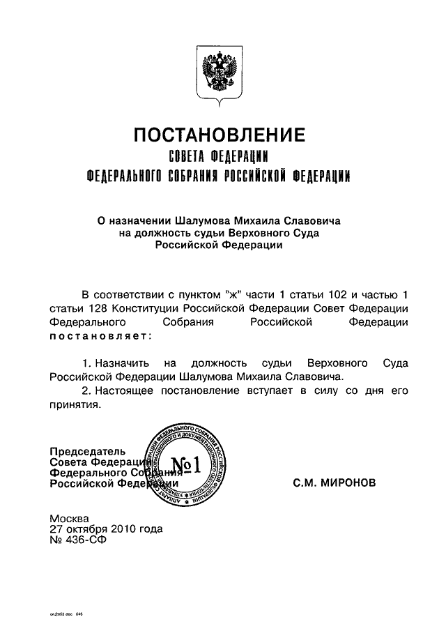 "О НАЗНАЧЕНИИ ШАЛУМОВА МИХАИЛА СЛАВОВИЧА НА ДОЛЖНОСТЬ СУДЬИ ВЕРХОВНОГО СУДА РОССИЙСКОЙ ФЕДЕРАЦИИ"