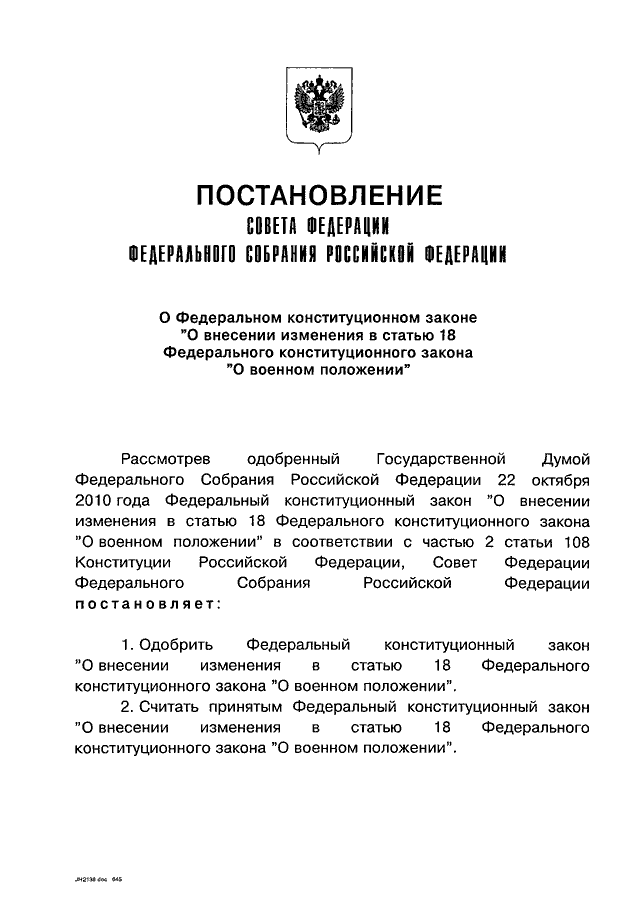 "О ФЕДЕРАЛЬНОМ КОНСТИТУЦИОННОМ ЗАКОНЕ "О ВНЕСЕНИИ ИЗМЕНЕНИЯ В СТАТЬЮ 18 ФЕДЕРАЛЬНОГО КОНСТИТУЦИОННОГО ЗАКОНА "О ВОЕННОМ ПОЛОЖЕНИИ"