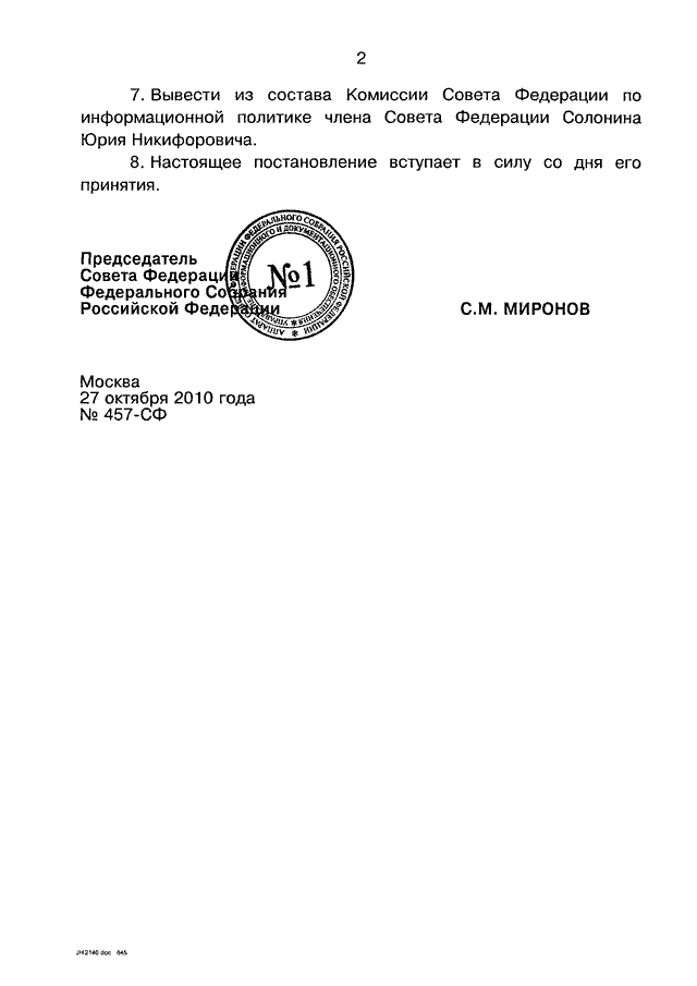 ПОСТАНОВЛЕНИЕ СФ ФС РФ от 27.10.2010 N 457-СФ