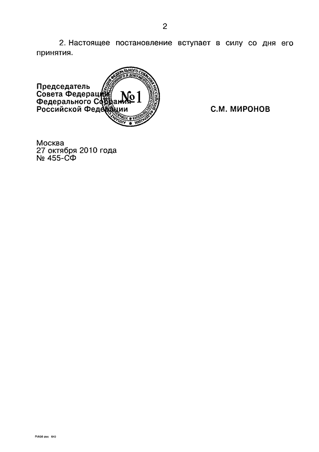 ПОСТАНОВЛЕНИЕ СФ ФС РФ от 27.10.2010 N 455-СФ