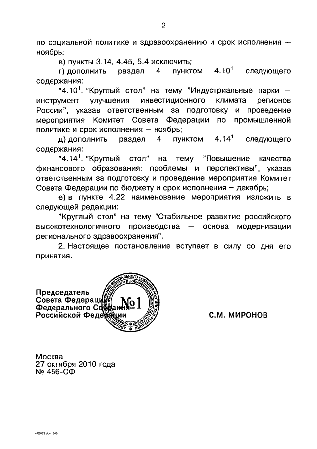 ПОСТАНОВЛЕНИЕ СФ ФС РФ от 27.10.2010 N 456-СФ