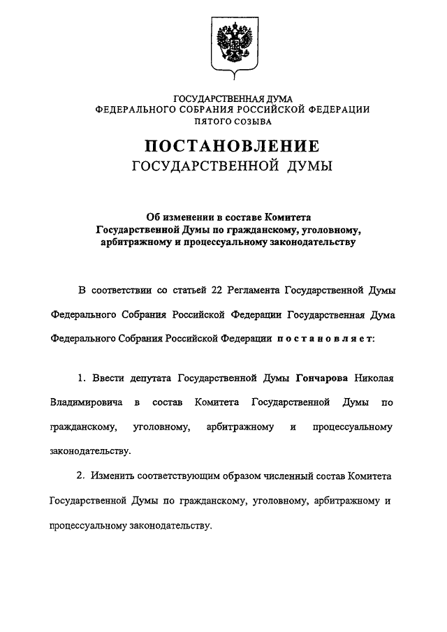 "ОБ ИЗМЕНЕНИИ В СОСТАВЕ КОМИТЕТА ГОСУДАРСТВЕННОЙ ДУМЫ ПО ГРАЖДАНСКОМУ, УГОЛОВНОМУ, АРБИТРАЖНОМУ И ПРОЦЕССУАЛЬНОМУ ЗАКОНОДАТЕЛЬСТВУ"