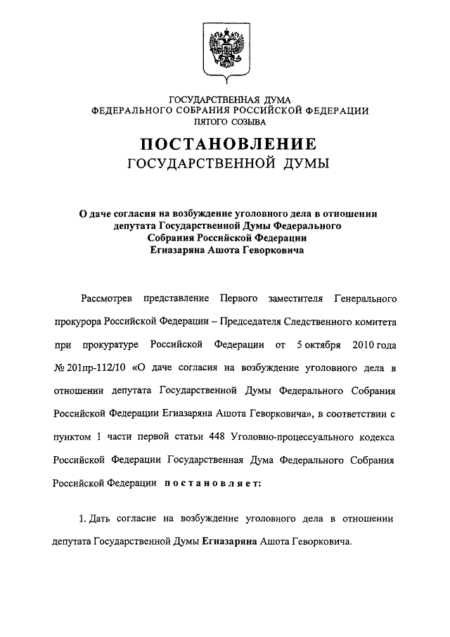 "О ДАЧЕ СОГЛАСИЯ НА ВОЗБУЖДЕНИЕ УГОЛОВНОГО ДЕЛА В ОТНОШЕНИИ ДЕПУТАТА ГОСУДАРСТВЕННОЙ ДУМЫ ФЕДЕРАЛЬНОГО СОБРАНИЯ РОССИЙСКОЙ ФЕДЕРАЦИИ ЕГИАЗАРЯНА АШОТА ГЕВОРКОВИЧА"