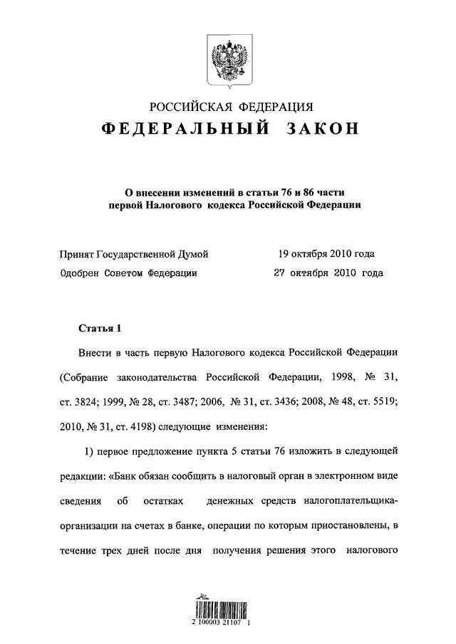 "О ВНЕСЕНИИ ИЗМЕНЕНИЙ В СТАТЬИ 76 И 86 ЧАСТИ ПЕРВОЙ НАЛОГОВОГО КОДЕКСА РОССИЙСКОЙ ФЕДЕРАЦИИ"