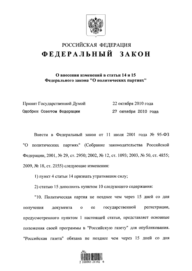 "О ВНЕСЕНИИ ИЗМЕНЕНИЙ В СТАТЬИ 14 И 15 ФЕДЕРАЛЬНОГО ЗАКОНА "О ПОЛИТИЧЕСКИХ ПАРТИЯХ"