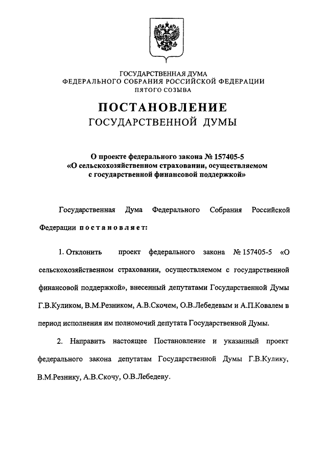 "О ПРОЕКТЕ ФЕДЕРАЛЬНОГО ЗАКОНА N 157405-5 "О СЕЛЬСКОХОЗЯЙСТВЕННОМ СТРАХОВАНИИ, ОСУЩЕСТВЛЯЕМОМ С ГОСУДАРСТВЕННОЙ ФИНАНСОВОЙ ПОДДЕРЖКОЙ"