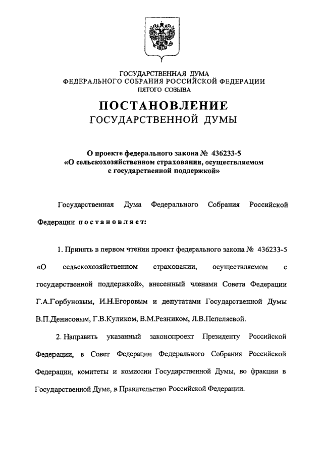 "О ПРОЕКТЕ ФЕДЕРАЛЬНОГО ЗАКОНА N 436233-5 "О СЕЛЬСКОХОЗЯЙСТВЕННОМ СТРАХОВАНИИ, ОСУЩЕСТВЛЯЕМОМ С ГОСУДАРСТВЕННОЙ ПОДДЕРЖКОЙ"