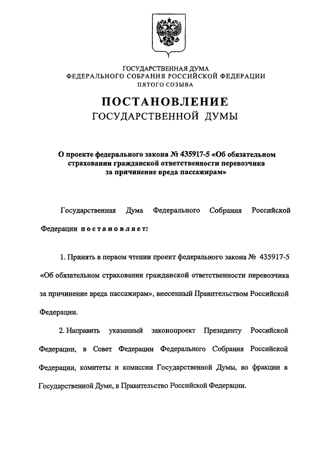 "О ПРОЕКТЕ ФЕДЕРАЛЬНОГО ЗАКОНА N 435917-5 "ОБ ОБЯЗАТЕЛЬНОМ СТРАХОВАНИИ ГРАЖДАНСКОЙ ОТВЕТСТВЕННОСТИ ПЕРЕВОЗЧИКА ЗА ПРИЧИНЕНИЕ ВРЕДА ПАССАЖИРАМ"