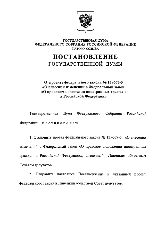"О ПРОЕКТЕ ФЕДЕРАЛЬНОГО ЗАКОНА N 139667-5 "О ВНЕСЕНИИ ИЗМЕНЕНИЙ В ФЕДЕРАЛЬНЫЙ ЗАКОН "О ПРАВОВОМ ПОЛОЖЕНИИ ИНОСТРАННЫХ ГРАЖДАН В РОССИЙСКОЙ ФЕДЕРАЦИИ"