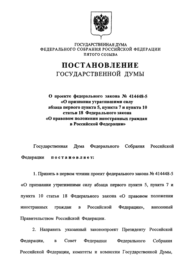 "О ПРОЕКТЕ ФЕДЕРАЛЬНОГО ЗАКОНА N 414448-5 "О ПРИЗНАНИИ УТРАТИВШИМИ СИЛУ АБЗАЦА ПЕРВОГО ПУНКТА 5, ПУНКТА 7 И ПУНКТА 10 СТАТЬИ 18 ФЕДЕРАЛЬНОГО ЗАКОНА "О ПРАВОВОМ ПОЛОЖЕНИИ ИНОСТРАННЫХ ГРАЖДАН В РОССИЙСКОЙ ФЕДЕРАЦИИ"