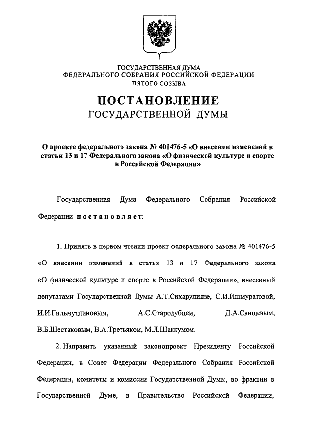 "О ПРОЕКТЕ ФЕДЕРАЛЬНОГО ЗАКОНА N 401476-5 "О ВНЕСЕНИИ ИЗМЕНЕНИЙ В СТАТЬИ 13 И 17 ФЕДЕРАЛЬНОГО ЗАКОНА "О ФИЗИЧЕСКОЙ КУЛЬТУРЕ И СПОРТЕ В РОССИЙСКОЙ ФЕДЕРАЦИИ"