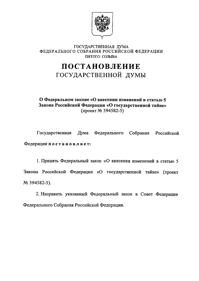"О ФЕДЕРАЛЬНОМ ЗАКОНЕ "О ВНЕСЕНИИ ИЗМЕНЕНИЙ В СТАТЬЮ 5 ЗАКОНА РОССИЙСКОЙ ФЕДЕРАЦИИ "О ГОСУДАРСТВЕННОЙ ТАЙНЕ" (ПРОЕКТ N 394582-5)"