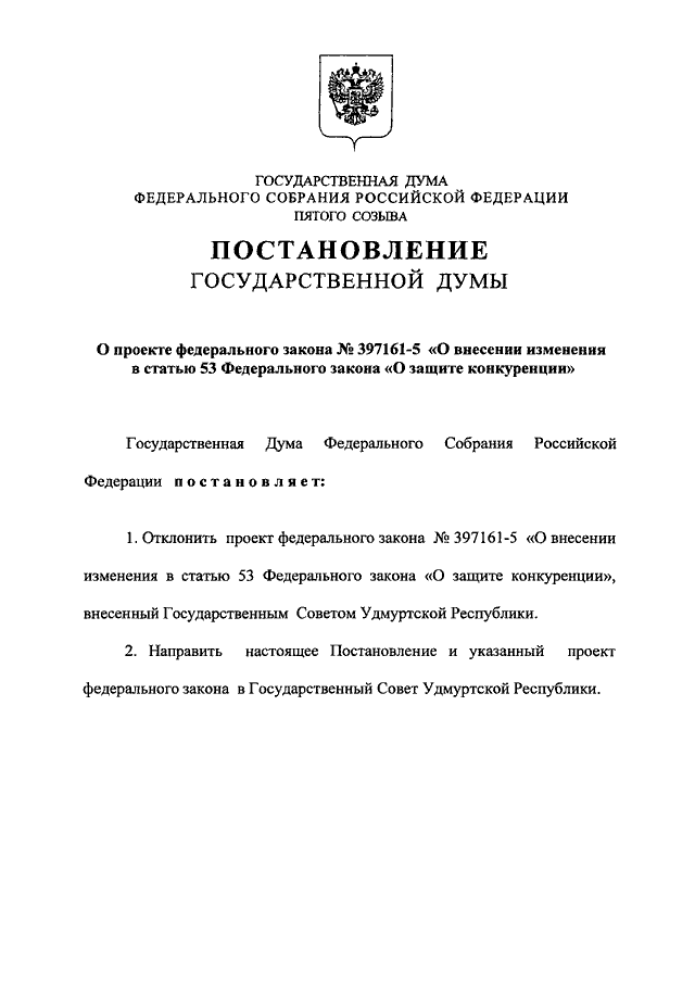 "О ПРОЕКТЕ ФЕДЕРАЛЬНОГО ЗАКОНА N 397161-5 "О ВНЕСЕНИИ ИЗМЕНЕНИЯ В СТАТЬЮ 53 ФЕДЕРАЛЬНОГО ЗАКОНА "О ЗАЩИТЕ КОНКУРЕНЦИИ"