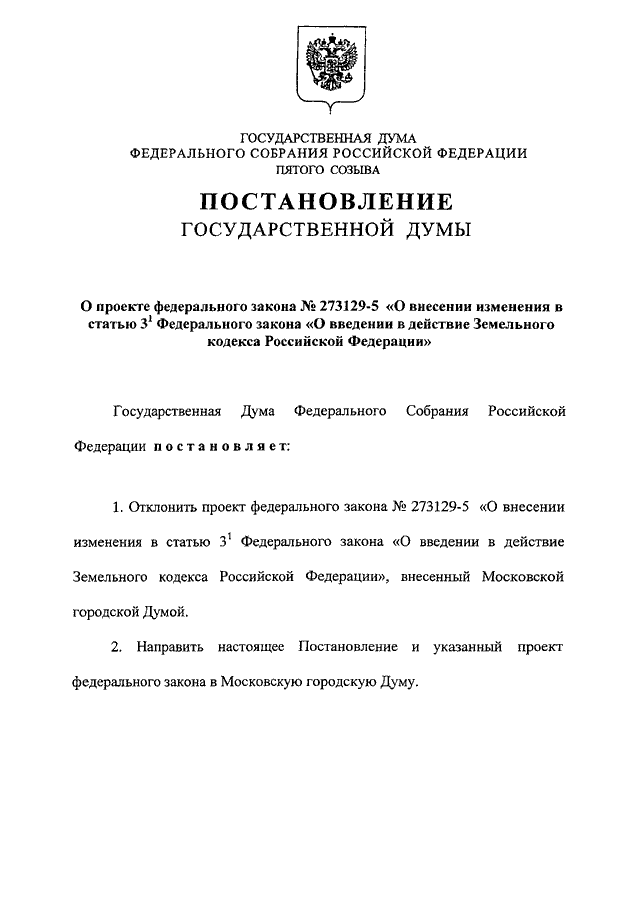 "О ПРОЕКТЕ ФЕДЕРАЛЬНОГО ЗАКОНА N 273129-5 "О ВНЕСЕНИИ ИЗМЕНЕНИЯ В СТАТЬЮ 3.1 ФЕДЕРАЛЬНОГО ЗАКОНА "О ВВЕДЕНИИ В ДЕЙСТВИЕ ЗЕМЕЛЬНОГО КОДЕКСА РОССИЙСКОЙ ФЕДЕРАЦИИ"