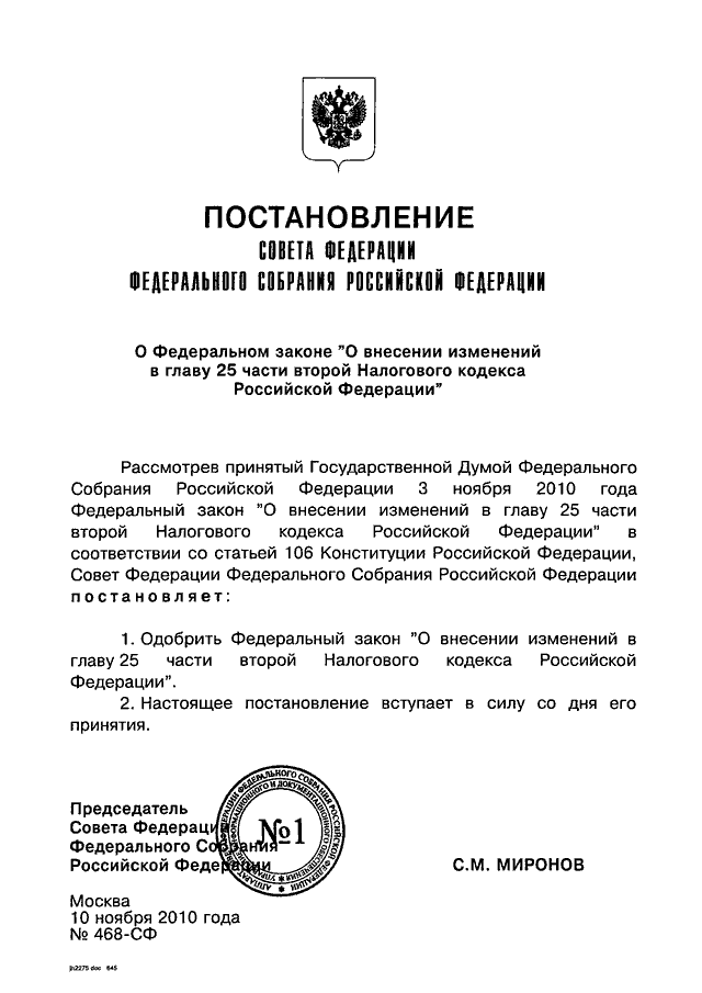 ПОСТАНОВЛЕНИЕ СФ ФС РФ от 10.11.2010 N 468-СФ