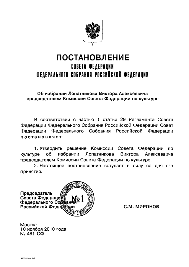 ПОСТАНОВЛЕНИЕ СФ ФС РФ от 10.11.2010 N 481-СФ