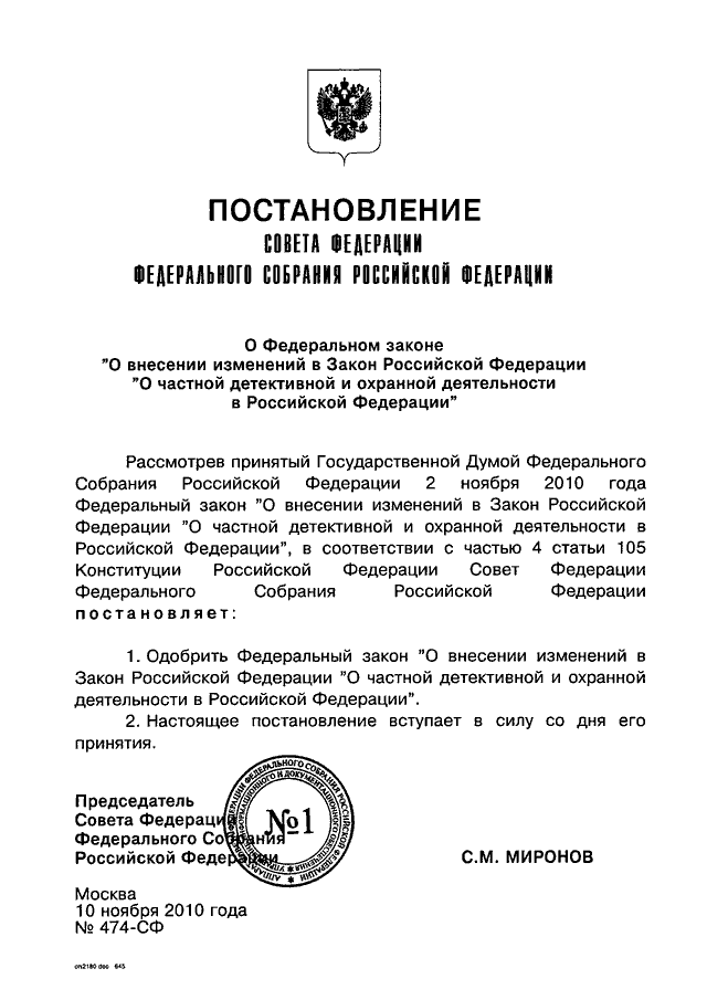 ПОСТАНОВЛЕНИЕ СФ ФС РФ от 10.11.2010 N 474-СФ