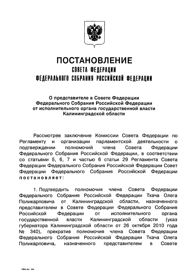 "О ПРЕДСТАВИТЕЛЕ В СОВЕТЕ ФЕДЕРАЦИИ ФЕДЕРАЛЬНОГО СОБРАНИЯ РОССИЙСКОЙ ФЕДЕРАЦИИ ОТ ИСПОЛНИТЕЛЬНОГО ОРГАНА ГОСУДАРСТВЕННОЙ ВЛАСТИ КАЛИНИНГРАДСКОЙ ОБЛАСТИ"