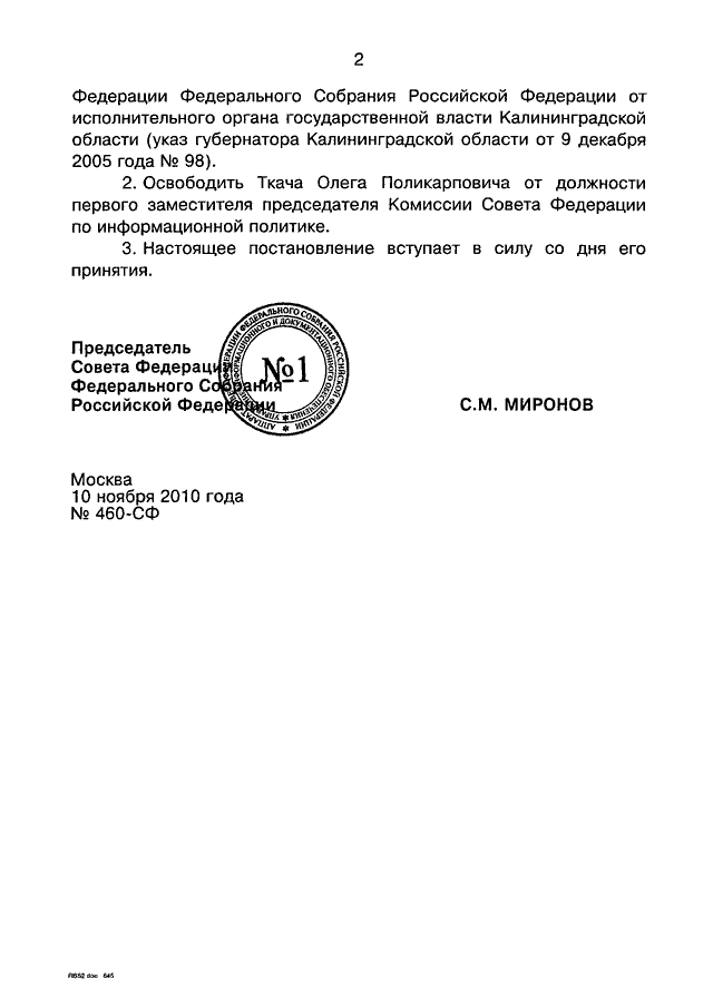 ПОСТАНОВЛЕНИЕ СФ ФС РФ от 10.11.2010 N 460-СФ